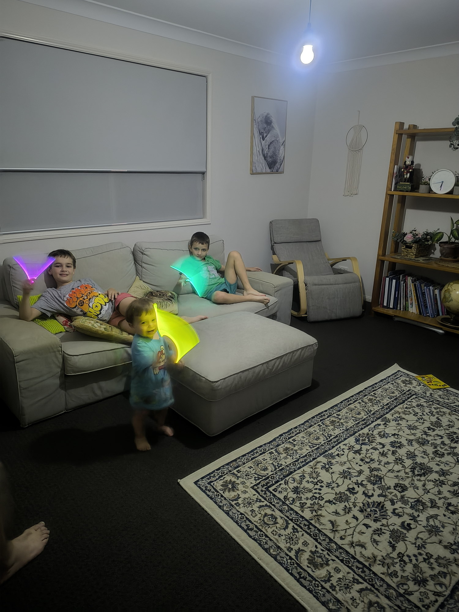 Шторм с градом и отключённом электричеством. Чаёк (в кастрюльке, по старинке) и светящиеся палочки! Дети счастливы!